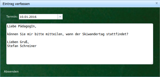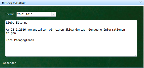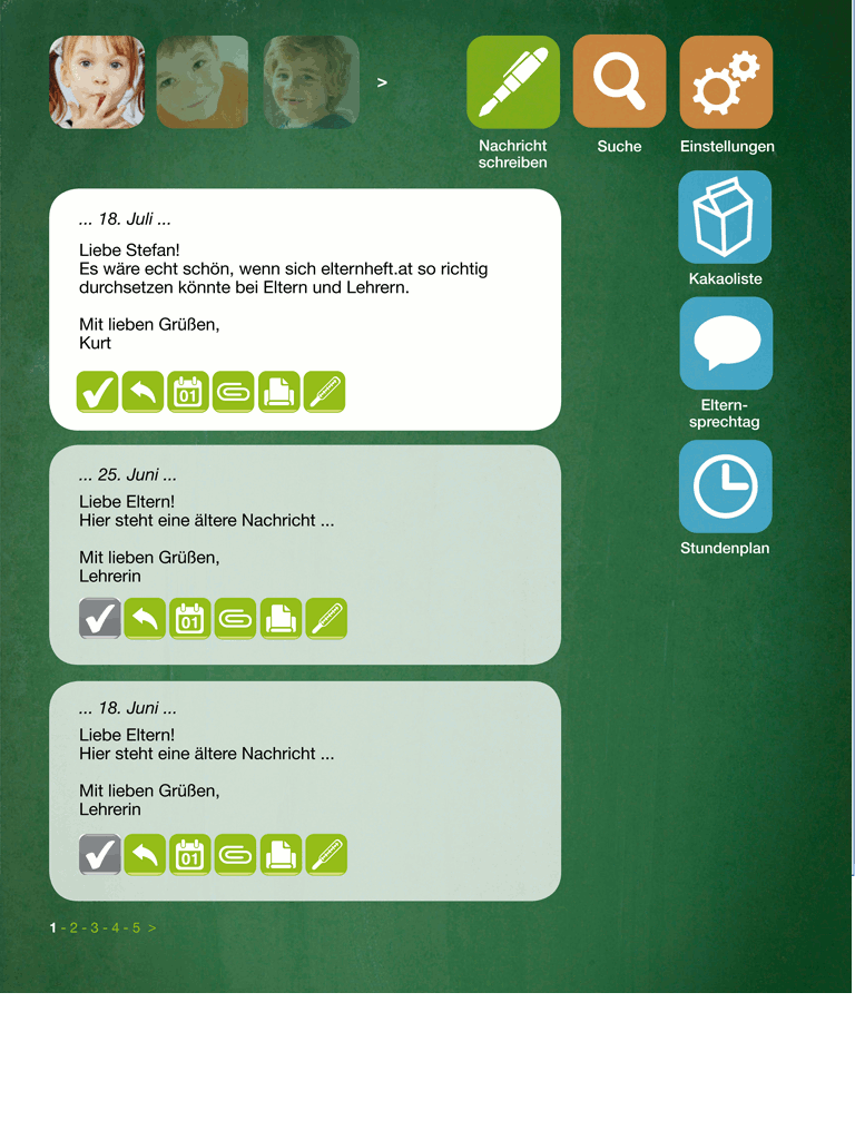 Das digitale Elternheft soll PädagogInnen und Eltern die täglich anfallende Administration und Organisation erleichtern. Sie können zB Benachrichtigungen an alle Eltern - oder gezielt an Eltern eines Kindes verschicken. Dies alles per Knopfdruck bequem vom Laptop/Desktop oder via Smartphone/Tablet. Drucker- und Warteschlangen adé! Ganz nebenbei: umweltfreundlich und "grün" werden Sie auch - weniger Bäume werden gefällt, die Elektrizitäts - wie auch Kopierkosten werden gesenkt, uvm.